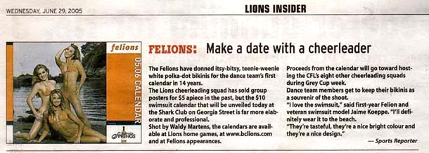 Dorinha Jeans Wear™ provided swimwear for The BC Lions' Felions 2005/06 Calendar, featuring the Felions cheerleaders of Vancouver's BC Lions football team.